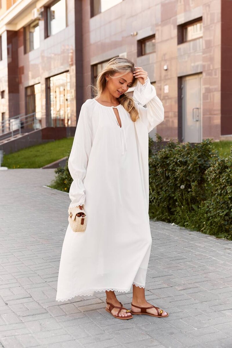 Модель свободного кроя с воздушными рукавами-реглан и акцентом на сборку по горловине спереди и сзади. Широкие рукава собраны на запястьях с мягкой резинкой, создавая выразительный объем. Изделие дополнено изящной отделкой из гипюра по низу рукавов и подолу, а также съемным тонким поясом, с которым вы легко регулируете силуэт по настроению. Внутри — подклад из основной ткани для дополнительного комфорта. Идеальный вариант для городских прогулок, отпусков и встреч без спешки⚡️
