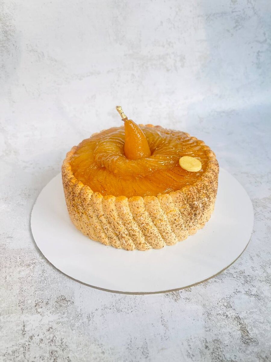 Бисквит, словно воздушный трон для груш, выложенных королевским веером. Это не десерт — это философия: когда великолепие рождается из уважения к ингредиентам.
