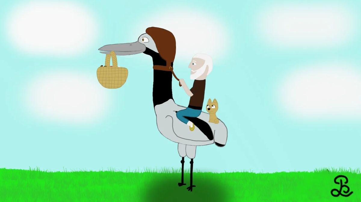 Птица почти готова взлететь, но пока ему тяжело было стоять с человеком и собакой на спине. Журавль спрашивает деда: