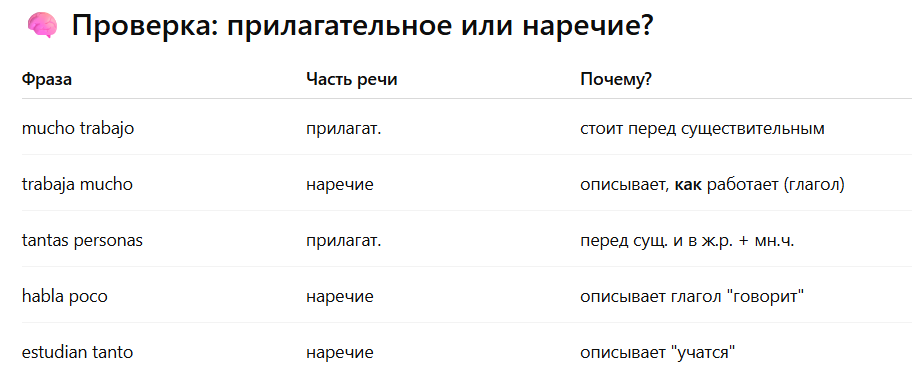 друзья всем привет это видео в котором мы с вами разберём важную тему про прилагательные и наречия Начнем с первых трех: mucho,poco,tanto. Здесь важно различать что они могут быть как прилагательными так и наречиями от этого многое будет зависеть - теперь давайте по порядку. MUCHO / POCO / TANTO (изменяются по роду и числу!) -поставить перед существительными - второе меняем их по роду и числу так же как это существительное (то есть они друг с другом согласовываются) 🟢 Согласуются по роду и числу!
