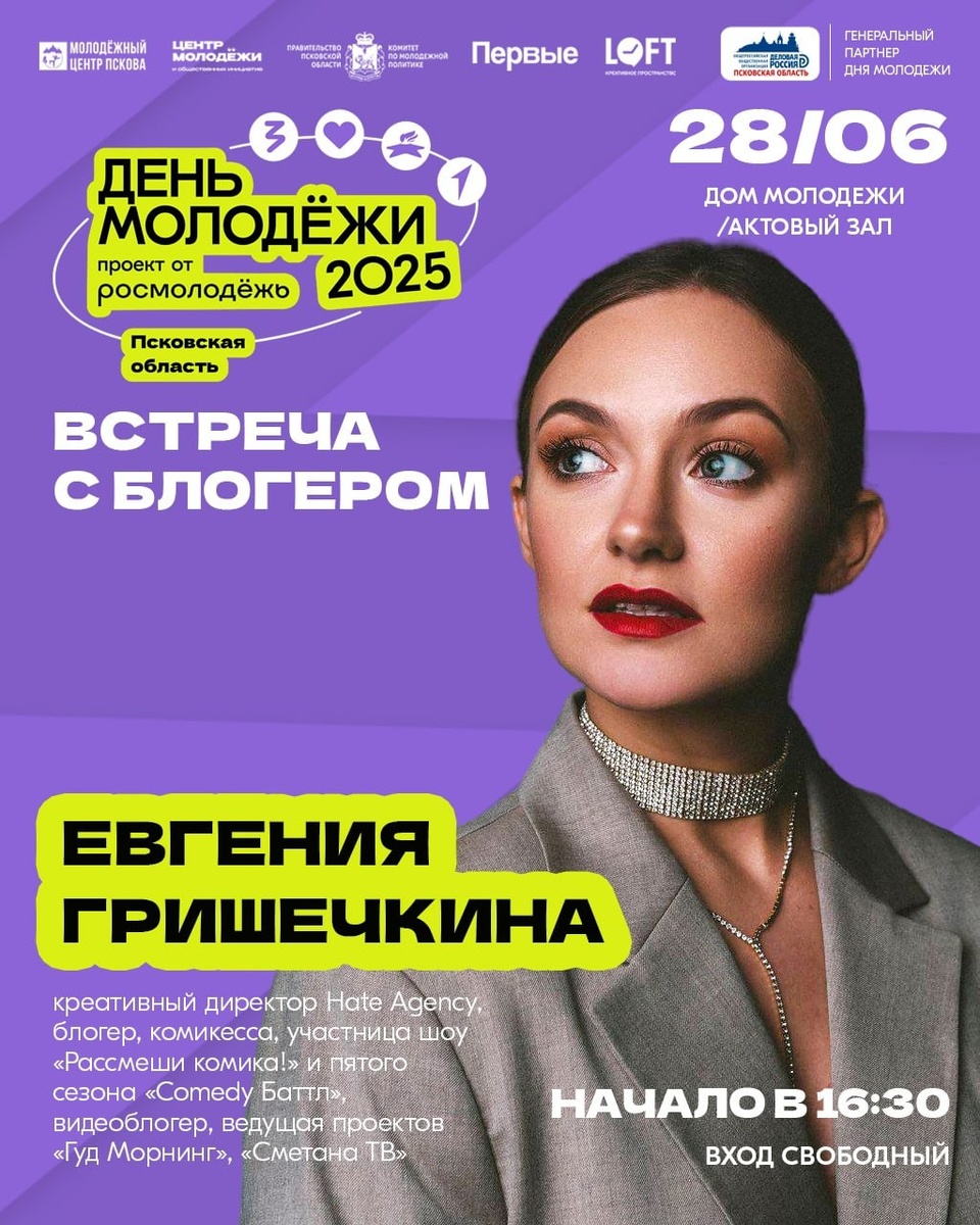🔥 ВСТРЕЧА С БЛОГЕРОМ! 🔥 📅 28 июня, в День молодежи, выступит Евгения Гришечкина — креативный директор Hate Agency. Она блогер, комикесса, участница шоу «Рассмеши комика!» и «Comedy Баттл». Евгения ведет проекты «Гуд Морнинг» и «Сметана ТВ». 👉 Хотите увидеться с Женей? Зарегистрируйтесь по ссылке.: vk.cc/cMUIBj. Это необходимо, чтобы знать, сколько человек придет. 📍 Встреча состоится в Доме молодежи 28 июня в 16:30. В конце встречи будет автограф-сессия для всех желающих. Оставайтесь с нами #НашаПсковскаяобласть