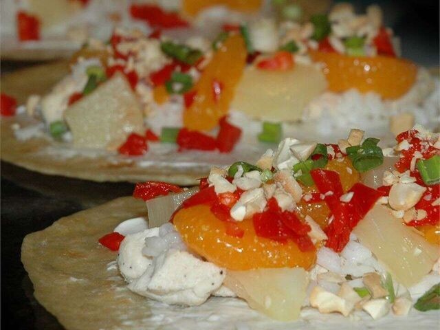 Мандариновые куриные роллы Эту идею я почерпнул в одном ресторане задолго до того, как обертывания стали популярны. Ресторан закрылся, и мне пришлось придумать, как сделать свои собственные. 🍴 Количество: 4 порции Ингредиенты ✅ 4 куриные грудки без кожи и костей ✅ соль и перец по вкусу ✅ 4 (25.00 см) мучных тортильи ✅ 1 (250 гр) упаковка сыра Neufchatel ✅ 1 (250 гр) банка мандариновых апельсинов, осушенных ✅ 1 (250 гр) банка ананасов, осушенных ✅ 2 зеленых лука, нарезанных ✅ ½ чашки нарезанного кубиками красного болгарского перца ✅ ½ чашки соленых кешью, нарезанных Инструкция приготовления 1. Сбрызните сковороду растительным маслом. Посолите и поперчите курицу. Разогрейте сковороду на среднем огне. Подрумяньте куриные грудки с обеих сторон, примерно по 4 минуты на сторону или до готовности. Выньте из сковороды и отложите в сторону. 2. Равномерно намажьте тортильи сливочным сыром. (Это будет "клей", который удержит все вместе). Нарежьте курицу на небольшие кусочки и разделите и