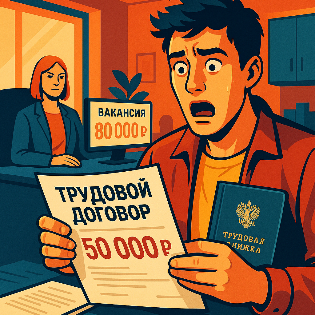 И вот наступает день «Х» – прихожу в отдел кадров оформляться. Мне протягивают трудовой договор, я начинаю его внимательно читать...и глазам своим не верю! В графе «оклад» стоит сумма… 50 000 рублей! Никаких упоминаний о премиях, бонусах или других доплатах, которые могли бы довести сумму до обещанных 80 тысяч, в договоре нет.