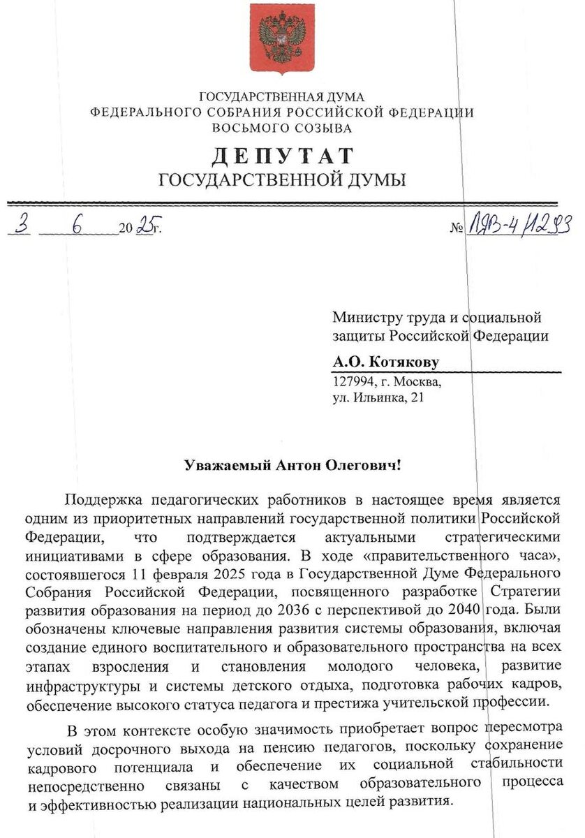 📈Предложила отменить 5-летнюю отсрочку выхода на досрочную пенсию для учителей, введённую ранее. ➡️Это позволит им уйти на пенсию, как было до пенсионной реформы, после 25 лет работы в школе и при наличии высшей категории. Также необходимо сократить минимальный стаж для педагогов с выдающимися достижениями. 🫥Отсрочка увеличила нагрузку на учителей предпенсионного возраста и снизила их мотивацию. Досрочная пенсия – важная компенсация за высокую физическую и психологическую нагрузку. 📈Сейчас учителям приходится работать сверхурочно, постоянно адаптироваться к новым стандартам. Они испытывают сильный стресс. ⏳Это подтверждается исследованиями: по данным Московской городской организации Профсоюза работников народного образования и науки РФ, фактическая недельная нагрузка учителя составляет 70,5 часов, почти вдвое превышая норму. Более того, 60% учителей регулярно испытывают психологический дискомфорт, а 85% находятся в состоянии постоянного стресса. 🫥 Растущая численность школьник