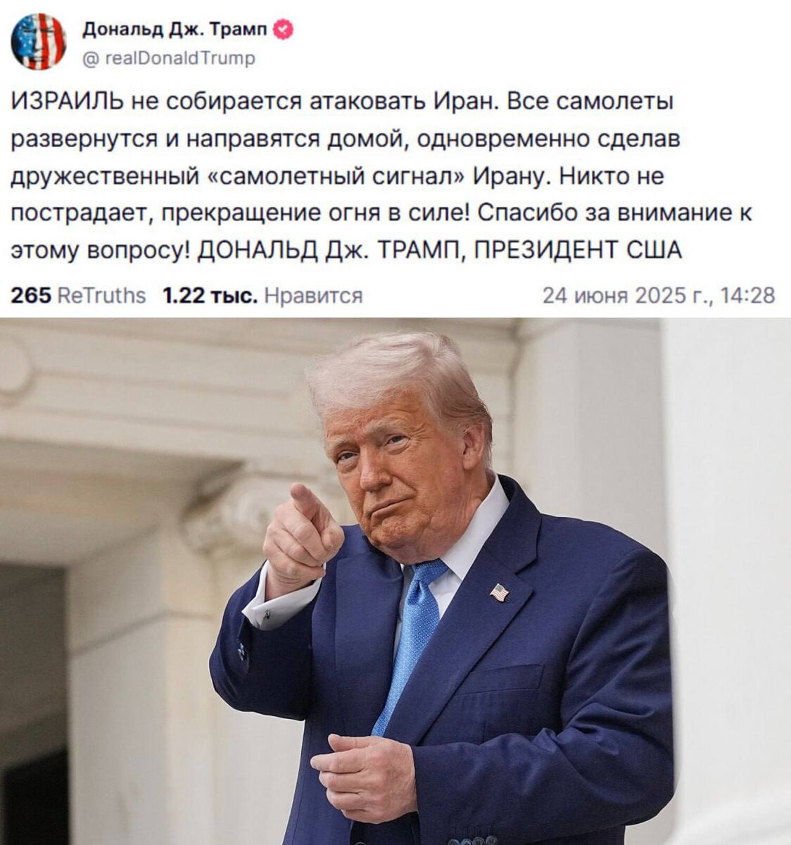 Трамп: Израиль не собирается атаковать Иран. Все самолеты развернутся и направятся домой, одновременно сделав дружественный «самолетный сигнал» Ирану.