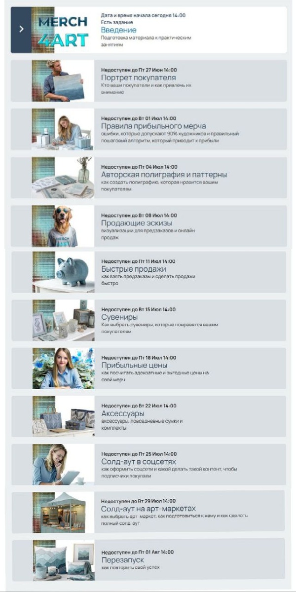На скриншоте - программа старт, которая началась сегодня. Если хотите научиться мыслить прибыльно, и делать мерч по любви - добавляйтесь в группу Полное описание обучения по ссылке ниже Merch4.art/june Вопросы пишите в личные сообщения Наталье @merch4_art 💙💙💙