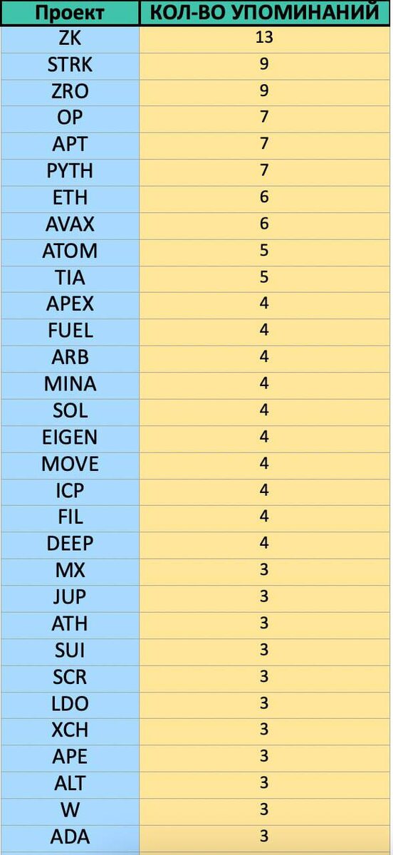 В ответ на пост #WATCHLIST ЧТО УЖЕ НИКОГДА НЕ ВЫРАСТЕТ ДЕРЖАТ В СНГ После моего поста Вы набросали мне на разбор аж 120 монет Даже в двухчасовом видео я разбираю обычно 70-80, а тут еще больше😃 Не знаю сколько часов займёт разбор + разберу ли все активы (так как есть очень специфически меньше ляма FDV даже и смотреть там нечего), но постараюсь в ближайшие дни записать видео по активам 🔹Перспективы 🔹Куда еще могут упасть 🔹Куда могут вырасти осенью 🔹Мой план действий и отношение к активам 🔹По некоторым ончейн гляну в Nansen В общем огромный фундаментальный анализ, как всегда Ну а сейчас Вы можете увидеть список самых популярных активов, которые набросали в комментариях (от 3-х упоминаний)😊 Делаем выводы… ✍️А из интересного, есть топовые активы, которые упоминались всего один раз! HYPE, UNI, S Что тоже показательно, надо отметить ✅ SaversNotes | Чат | 🎥YouTube 💎 Tangem | ADS | 🔎 OKX | 💸Обменник | 🤓NANSEN