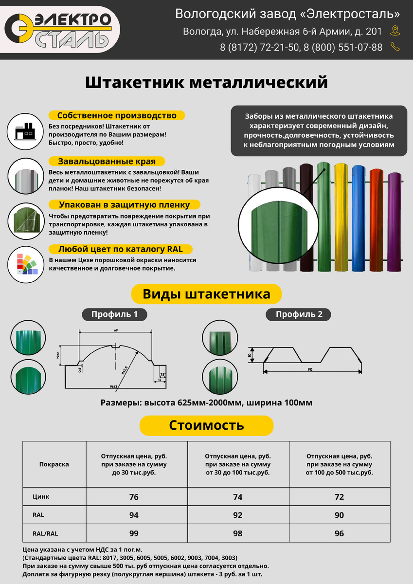 Цена профлистов относительно невысока по сравнению с аналогичными материалами, такими как кирпич, дерево или камень. Стоимость зависит от толщины металла, типа профиля и качества покрытия. Благодаря разнообразию расцветок и форматов листов владельцы имеют возможность выбрать подходящий вариант оформления своего участка.Помимо стандартных оттенков производители предлагают специальные дизайнерские коллекции с различными фактурами поверхности, имитирующими природные материалы, такие как камень или древесину. Это позволяет создать уникальный стиль забора, гармонично вписываясь в окружающий ландшафт.