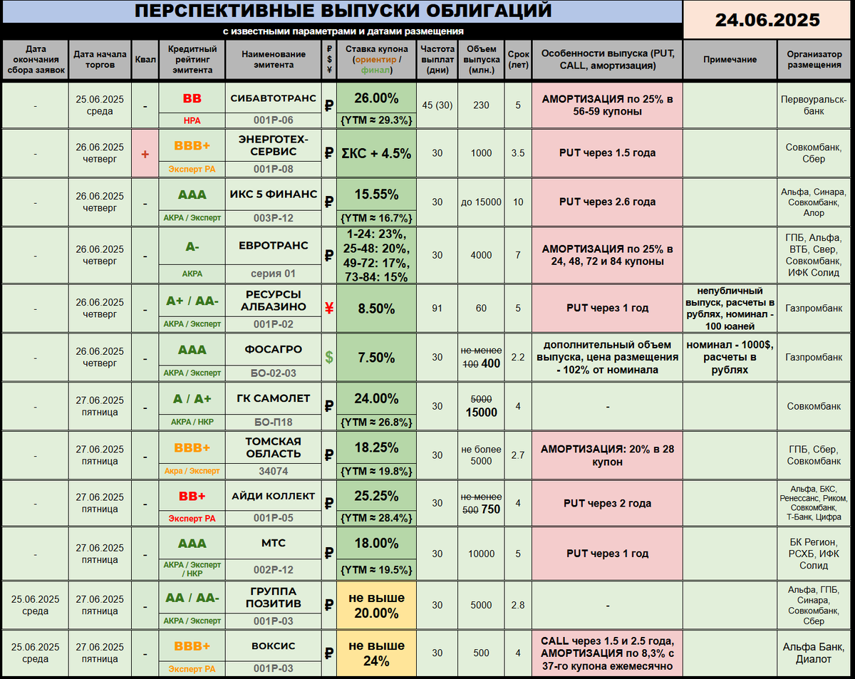 🔆 ВТБ ФАКТОРИНГ (🅰️🅰️) анонсирует размещение выпусков 001Р-01 и 001Р-02, публичность которых под большим вопросом. Первый выпуск начнет свой биржевой путь 26 июня, второй - 27 числа. Объемы выпусков не разглашены пока, а параметры одинаковы: флоатеры с премией к КС в размере 1,43% и ежемесячными выплатами, срок обращения - 420 дней. В целом, жалеть не стоит, если в стакане не встретятся :) В таблицу выпуски вносить не буду, там и так тесновато.