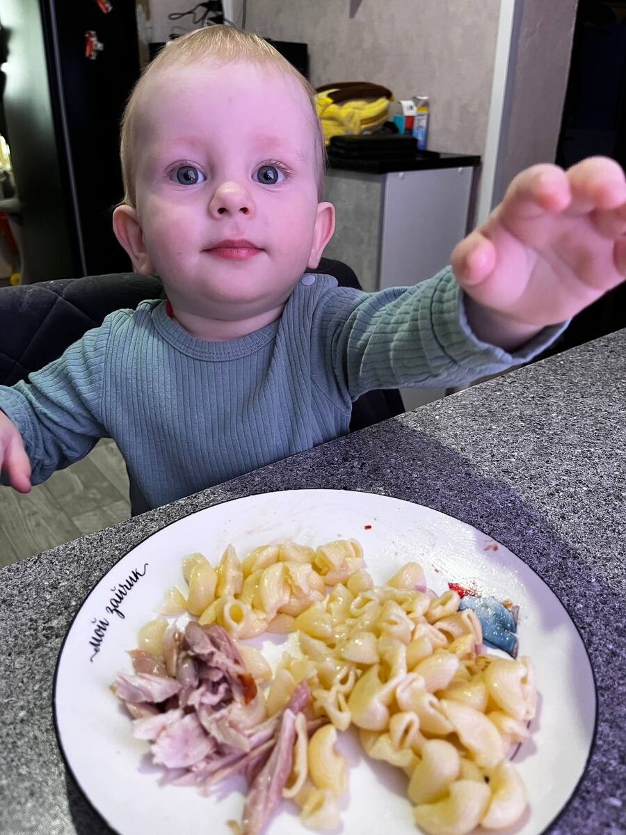 Семёну сейчас 1,2 года и он уже ест многие блюда с «нашего» стола. У него появился большой интерес к разным продуктам. Что сейчас мы ему даем? Практически всё, естественно не острое, без приправ. Сегодня у Семёна макароны (он ест только «рожки») и куриная голень запеченная в духовке. Самой главной проблемой у нас является отсутствие зубов, Сёме очень трудно жевать пищу. На сегодняшний день у него 5 зубов и шестой только вышел. Но ничего, потихоньку справляемся☺️