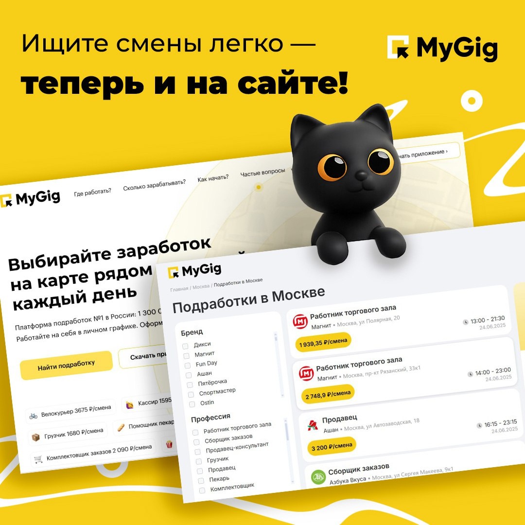 Переходите на https://mygig.ru/, нажмите на жёлтую кнопку «Найти подработку», чтобы мгновенно увидеть доступные смены в вашем городе или регионе и убедиться лично 👍