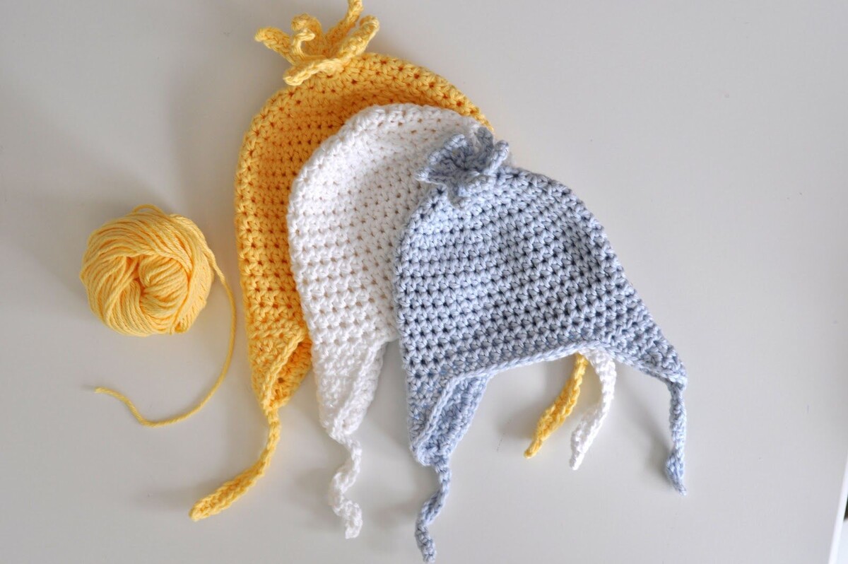 Для того чтобы сделать завязки можно провязать цепочки воздушных петель необходимой длины, а затем обвязать их столбиками без накида. Другой вариант – взять несколько ниточек, с помощью иголки продеть через край шапочки и заплести в косичку.