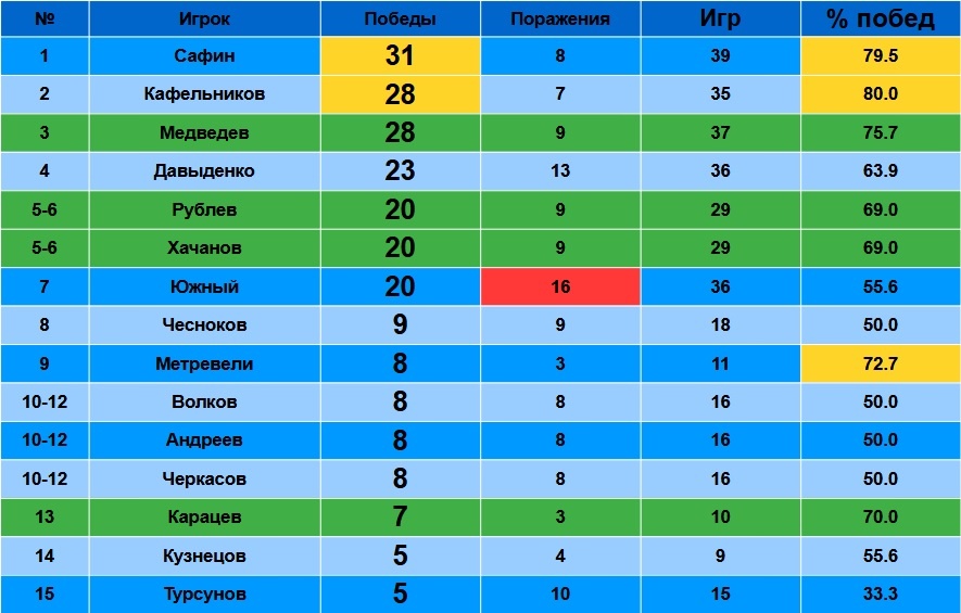 Желтым цветом в столбцах выделял лучшие результаты, красным цветом – худшие. Также желтым цветом в столбце «% побед» выделил ячейки с процентом побед выше 70.
