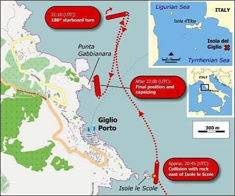 На судне этом (а, может, и на других круизниках данной компании) существует красивый древний обряд - сойдя немного с маршрута круиза, приблизиться к итальянскому островку Джильо, где проходил какой-то фестиваль и произвести так называемый "салют" гудками. Капитан Скеттино только этим судном уже командовал пять лет, не считая других, и проделывал такое ранее: ничто не предвещало, как говорится...