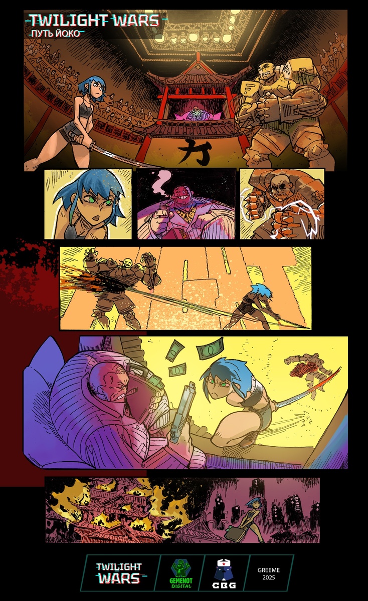 К релизу российской киберпанковской РПГ Twilight Wars в духе Darkest Dungeon, который состоялся 23 мая в Steam и VK Play сразу трое художников в коллаборации выпустили три серии одностраничных комиксов Twilight Wars. Комиксисты Евгений Федотов (ВК-паблик "Кошки-мышки") и авторы под никами ООО СУПЕРЗЛО и FRANTSEV выпустили три одностраничных комикса по игре: