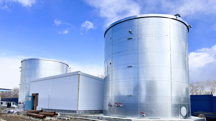 Для нужд клиента были изготовлены два сборных стальных резервуара, суммарным объёмом 704 м3, диаметром - 7.80м, высотой - 8.37м. Конструкции были собраны за неделю стандартной группой монтажников FLAMAX. В перспективе они будут работать единым модулем с уже имеющейся на объекте насосной станцией.