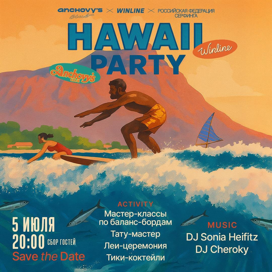 Winline и Anchovy's Club – новый серф-спот Москвы — открывают серию ивентов в знак старта коллаборации. Первая, Hawaii Party, пройдет уже 5 июля с 20:00.
