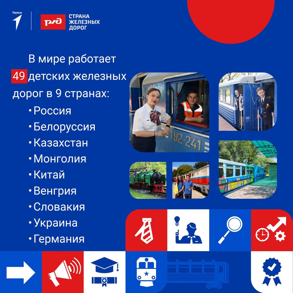 ⏰ 90 лет назад в Тбилиси открылась первая детская железная дорога. С тех пор такие магистрали распространились по всему миру! Сегодня в структуре РЖД работают 26 детских дорог. В Движении юных железнодорожников учатся более 18 000 школьников! Ребята от 11 до 17 лет погружаются в мир железнодорожных профессий: рельсы, шпалы, поезда и пассажиры 👨 Дети и подростки изучают технику, пробуют себя в разных профильных предметах, занимаются творчеством и побеждают в конкурсах всех уровней — от региональных до международных! 🚆 В карточках делимся интересными фактами про деятельность друзей Движения Первых — скорее читай!