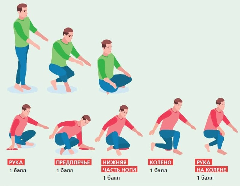 – Минус 2 балла, если опирались руками или не смогли сесть/встать.