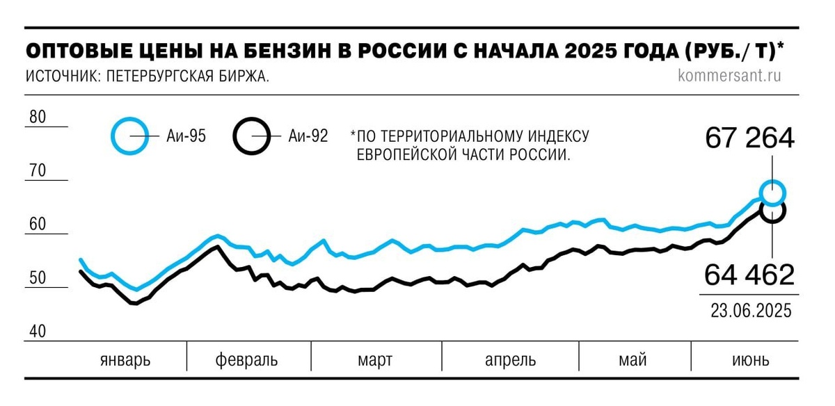 ⛽️ Цены на бензин в России бьют рекорды Оптовая цена бензина в России вновь начала активно расти. С 6 июня котировки АИ-92 резко выросли на 10,8% и достигли рекорда с осени 2023 года, АИ-95 – на 9,7%. Среди официальных причин называют сокращение предложения из-за подрывов и последующих ремонтов НПЗ в России, рост спроса на бензин среди населения, а также с опасениями роста цен на нефть из-за ситуации вокруг Ирана. Ключевая же причина, которая не называется участниками рынка, является попытка компенсировать выпадающие доходы от внешней торговли – внутренним рынком.