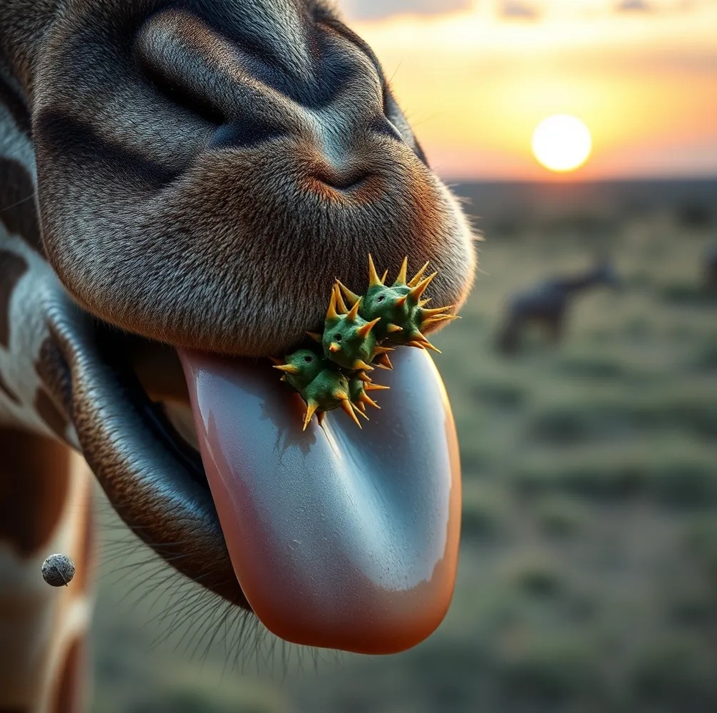 Представьте: грациозный жираф обвивает ветку акации темно-синим языком — будто инопланетный герой! Этот уникальный цвет — не причуда природы, а гениальное изобретение эволюции для выживания в африканской жаре. 🌍 3 причины синевы: наука в действии 1. Солнцезащитный крем: Язык жирафа содержит меланин (как в человеческой коже), который защищает от ультрафиолета. Без него орган получил бы ожог за 15 минут кормления! Интересно: У жирафят языки розовые — пигмент появляется к 3 месяцам. 2. Антибактериальный щит: Темный цвет создают плотные капилляры с насыщенной кислородом кровью. Это убивает бактерии с колючих растений. 3. Маскировка от хищников: Синий язык незаметен на фоне листвы — когда жираф ест, львы не видят движения. 📏 Цифры, от которых захватывает дух: - Длина языка: до 53 см (как рука взрослого человека!) - Сила захвата: тянет ветки с усилием 20 кг - Термостойкость: выдерживает температуру +50°C 🦒 5 удивительных фактов о "живом экскаваторе"