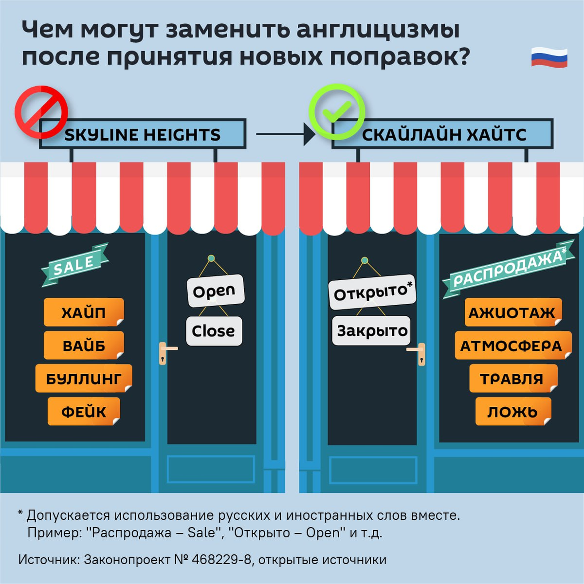Главные нововведения: Англоязычные названия можно будет и дальше использовать, но только в качестве перевода обязательных вывесок на русском языке. Например, разрешены переводы "Open" или "Sale" в туристических местах наряду с русскими "Открыто" и "Распродажа". Причём надписи должны быть равнозначными. Такое же правило дублирования будет по отношению к вывескам на национальных языках народов РФ. Названия жилых комплексов — только на русском языке, либо на английском, но с использованием кириллицы. Те названия, которые уже есть, закон не затронет и будет действовать только по отношению к вновь создаваемым объектам. Если слово уже укоренилось в русском языке и внесено в официальный словарь, то его использование ограничено не будет. Например, Wi-Fi.