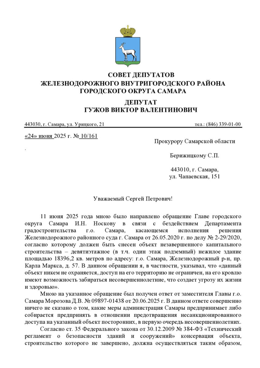 Продолжаем битву с Администрацией г.о. Самара по сносу незавершённого объекта строительства на пр. Карла Маркса, 57. Направил депутатское обращение Прокурору Самарской области Берижицкому С. П.