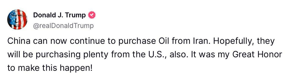 В ответ на пост 'China can now continue to purchase Oil from Iran. Hopefully, they will be purchasing plenty from the U.S., also' — Trump via Truth Social Seems like someone’s passing flight time to NATO by posting...