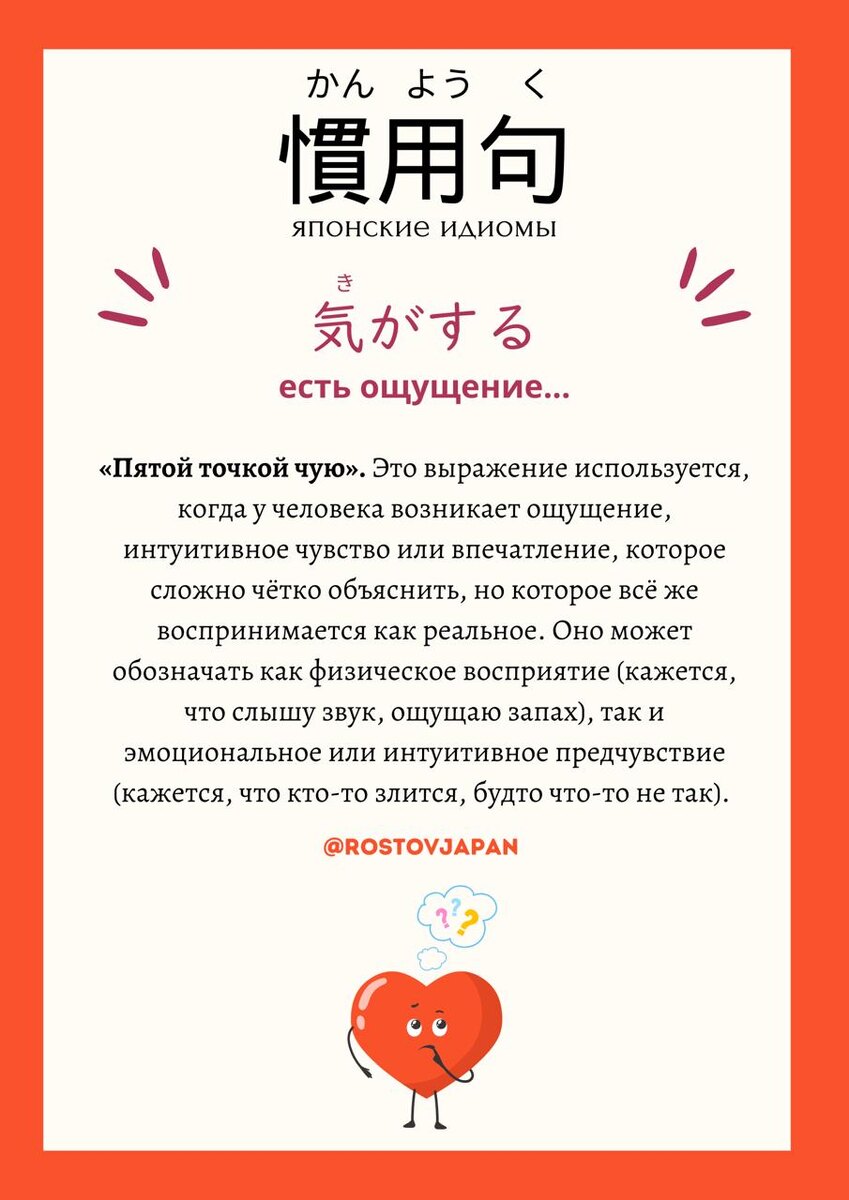 ✨ 9 японских идиом с 気 (き) Или как японцы описывают свои эмоции и душевное состояние через одно слово — 気 («дух», «внимание», «ощущение») 🧠💭💓 ❶ 気がする(き が する) — есть ощущение… Когда интуитивно чувствуешь: «что-то не так», «вроде бы слышу», «кажется, кто-то злится»... Пятая точка чует! 🧐🌫️ ❷ 気を取られる(き を とられる) — внимание похищено Смотришь в одну точку — и всё упустил 😵💫. Ошибки случаются, когда внимание уходит(переключено, похищено) на что-то другое. ❸ 気が散る(き が おちる) — внимание рассеивается Мысли как птицы — разлетаются в разные стороны 🕊️. Шум, тревога, суета мешают сосредоточиться. Полный расфокус. ❹ 気が向く(き が むく) — душа к чему-то лежит Никто не заставляет, просто вдруг захотелось что-то сделать ☁️💫. Настроение появляется само. Душа в рай! ❺ 気が重くなる(き が おもく なる) — становится тяжело на душе Когда ждёт тяжёлая встреча или разговор, и душа словно под прессом 😣🪨. ❻ 気が済む(き が すむ) — напряжение стихает Сказал, что думал, сделал, что хотел — и стало легче. Душа отпустила, напряжение