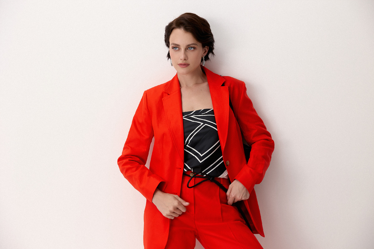 • Свободный крой, тонкая полоска и лаконичный пояс — детали, которые формируют целостный образ.