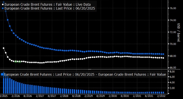 Перемирие между Израилем и Ираном возвращает фокус рынка на падение цены Brent до $60 за баррель. Кривая фьючерсов на нефть Brent. По словам нефтяного аналитика Bloomberg Intelligence Салиха Йылмаза, перемирие между Израилем и Ираном, если оно останется в силе, резко снизит риск перебоев с поставками и снимет бо́льшую часть премии за рискм, резко возросшей после нападения Израиля на Иран в начале этого месяца. Поскольку потоки нефти не пострадали, а Израиль и Иран согласились на временное перемирие, непосредственные риски поставок уменьшаются, а падение цен на нефть марки Brent предполагает, что премия за риск может продолжить снижаться, если только режим прекращения огня не будет нарушен. Во второй половине года рынку следует вновь сосредоточиться на слабых фундаментальных факторах и надвигающемся избыточном предложении, поскольку спрос на нефть окажется неудовлетворительным, а ОПЕК+, как ожидается, восстановит часть добычи, что приведет к снижению цен на нефть до уровня в 60 долларов