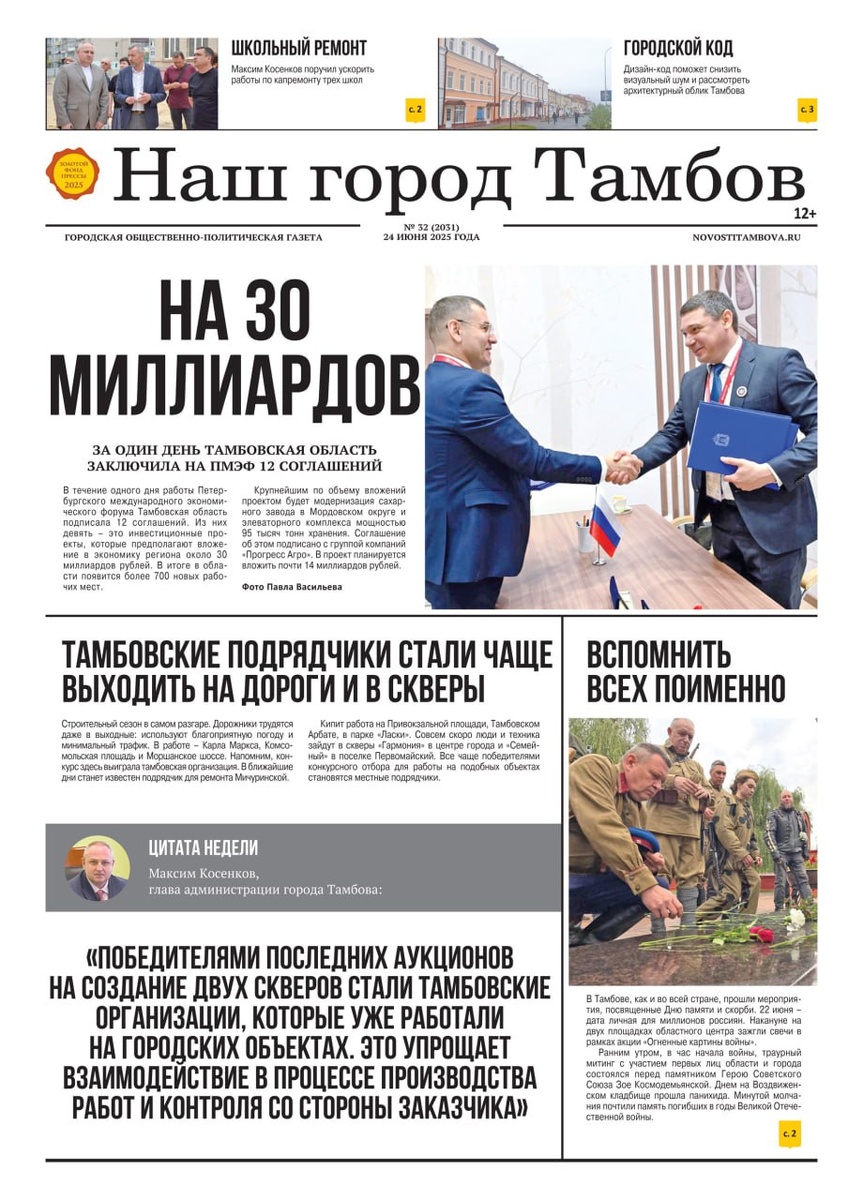 Друзья, выходит новый номер нашей газеты. В выпуске: 🇷🇺В Тамбове почтили память погибших в годы Великой Отечественной войны 🛠Максим Косенков проверил ход капремонта в школах 🌳Благоустройством скверов "Гармония" и "Семейный" займутся тамбовские подрядчики 👀В Тамбове продолжается работа по снижению визуального шума 🔨На Тамбовском Арбате укладывают тротуарную плитку ✅Журналист НГТ расскажет, зачем Тамбову Генеральный план, и как с ним должны согласовываться муниципальные программы 🇷🇺Долг – Отечеству: капитан Кириллов навсегда вписал свое имя в военную историю России ✍️Писатель Владимир Селивёрстов отмечает 80-летие 🏠Проект "Пойдем погуляем": история улицы Ленинградской 🙎♂️🙍♀️Корреспондент НГТ выяснил, чем живет и к чему стремится будущее Тамбова 🐕Тамбовские силовики показали, как готовят служебных собак Эти и другие материалы вы найдете на страницах газеты «Наш город Тамбов». Ищите в киосках города, читайте на сайте novostitambova.ru и нашем ТГ-канале