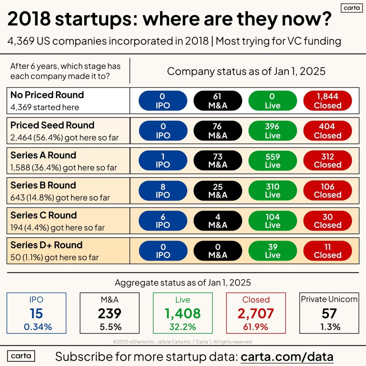 62% (2700) закрылись, 32% все еще работают (молодцы), на IPO вышли 0.34%.