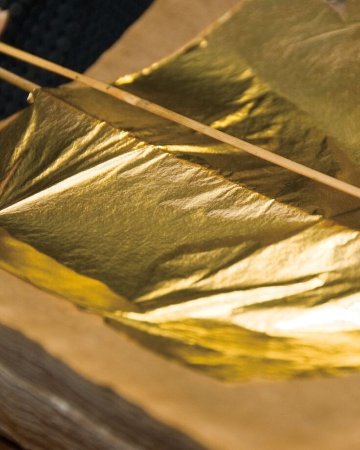 Потом — самое сложное. Лист кладут между листами особой бумаги васи и бьют деревянным молотом нукибо 20 000 раз. Каждый удар — точный, под одним углом. Через три дня золото превращается в квадрат 1×1 метр. Его можно поднять только бамбуковыми щипцами — от дыхания оно сомнётся.