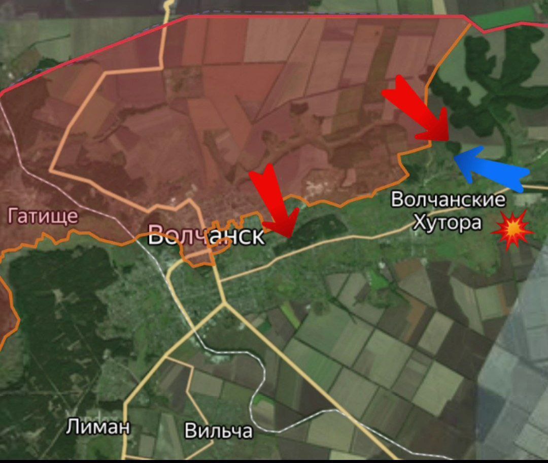 🔻 Также российские войска выбили противника из опорного пункта в районе села Волчанские Хутора и продвинулись вперёд по направлению к населённому пункту.