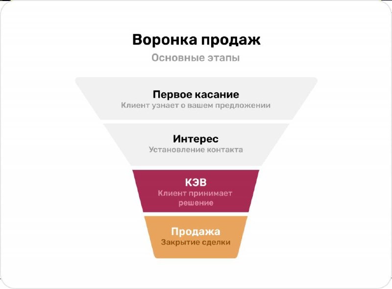 🚀 Ключевой Этап Воронки Продаж: Как Определить и Выстроить Отдел Продаж на Успех Есть один важный шаг, который может стать решающим для успеха вашей компании — это определить ключевой этап воронки продаж (КЭВ). Давайте разберемся, что это такое и как правильно выстроить работу отдела продаж, чтобы этот этап стал вашим конкурентным преимуществом. 🔍 Что такое КЭВ? КЭВ — это тот момент в воронке продаж, когда клиент принимает решение о покупке. Определение этого этапа критически важно для бизнеса, так как именно здесь происходит конвертация интереса в действие. Для каждого бизнеса КЭВ может быть разным: для одних это может быть демонстрация продукта, для других — подписка на пробный период, а для нас это личная встреча с клиентом. 📈 Как Определить КЭВ? 1. Анализ Воронки Продаж: Начните с анализа текущих этапов вашей воронки. Где клиенты начинают терять интерес? Это может быть сигналом о том, что именно на этом этапе вам нужно сосредоточиться. 2. Обратная Связь от Клиентов: Прове