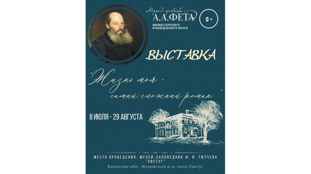 8 июля в музее-заповеднике Ф.И. Тютчева «Овстуг» пройдет церемония открытия выставки "Жизнь моя- самый сложный роман" из фондов Музея- усадьбы А.А. Фета (Курская область). Она посвящена 205-летию со дня рождения замечательного поэта-чародея Афанасия Афанасьевича Фета. Открытие выставки пройдет в рамках праздничных мероприятий, посвященных Дню семьи, любви и верности. Впервые посетители узнают о судьбе имения Воробьевка, где сейчас можно отдохнуть от городской суеты и шума, побродить по парку, полюбоваться лебедями, фазанами, борзыми собаками. У посетителей будет возможность прикоснуться к великому наследию русского поэта, чьё имя навсегда вошло в историю литературы. Возрастные ограничения: 0+ В Овстуге откроется выставка к 205-летию со дня рождения Афанасия Фета