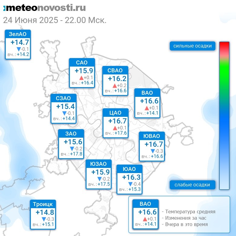 В 22:00 в Москве было от +14.5°C до +17°C, средняя температура +16°C #погода #Москва #лето #температура #24июня #вторник