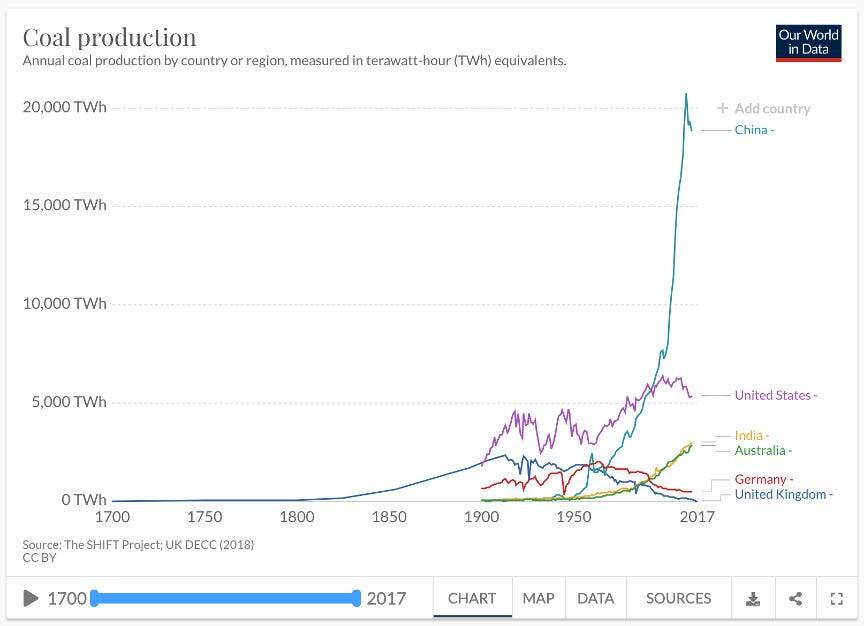 Чтобы проиллюстрировать это, возьмём в качестве примера уголь. Уголь был синонимом тяжёлой промышленности со времён промышленной революции в Великобритании в 18м веке. График, показывающий добычу угля за четверть тысячелетия, хорошо отражает промышленную историю мира. Грубо говоря, такая история была бы написана в трех главах: доиндустриальная эпоха; эпоха классического западного индустриализма, в котором доминировали Великобритания, США и Германия, простиравшаяся с 1850-х годов до конца 20-го века; и затем китайская эпоха, которая началась с 21-го века.