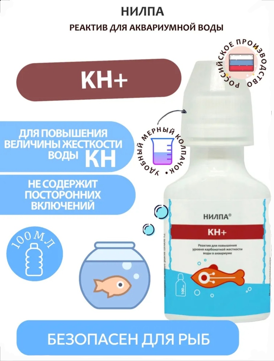 Основные характеристики и применение реактива НИЛПА КН+ (KH+) 1. Назначение Реактив предназначен для повышения карбонатной (временной) жесткости воды (kH) в аквариуме. Оптимальный уровень kH для большинства рыб и растений составляет 5–10° kH. При недостаточной жесткости воды биологические процессы нарушаются, что негативно сказывается на обитателях аквариума . 2. Состав и внешний вид Жидкость светло-голубого или бесцветного оттенка, без посторонних включений. Состав не раскрывается производителем, но пользователи отмечают наличие карбонатов калия (K₂CO₃), что подтверждается тестами на калий . 3. Дозировка - 5 мл реактива на 40 л воды повышают kH на 1° . - Для точного расчёта дозы предварительно измерьте kH тестом (например, НИЛПА Тест-kH) . - Максимальное изменение за 12 часов — не более 2.5° kH во избежание стресса у рыб . 4. Особенности использования - Содержит калий: При внесении 20 мл на 100 л воды концентрация калия повышается на 13.9 мг/л. Это позволяет