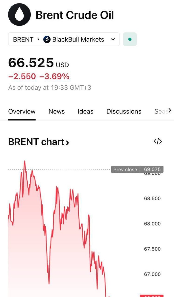 📉 Цена нефти Brent обвалилась до 65 долларов за баррель.