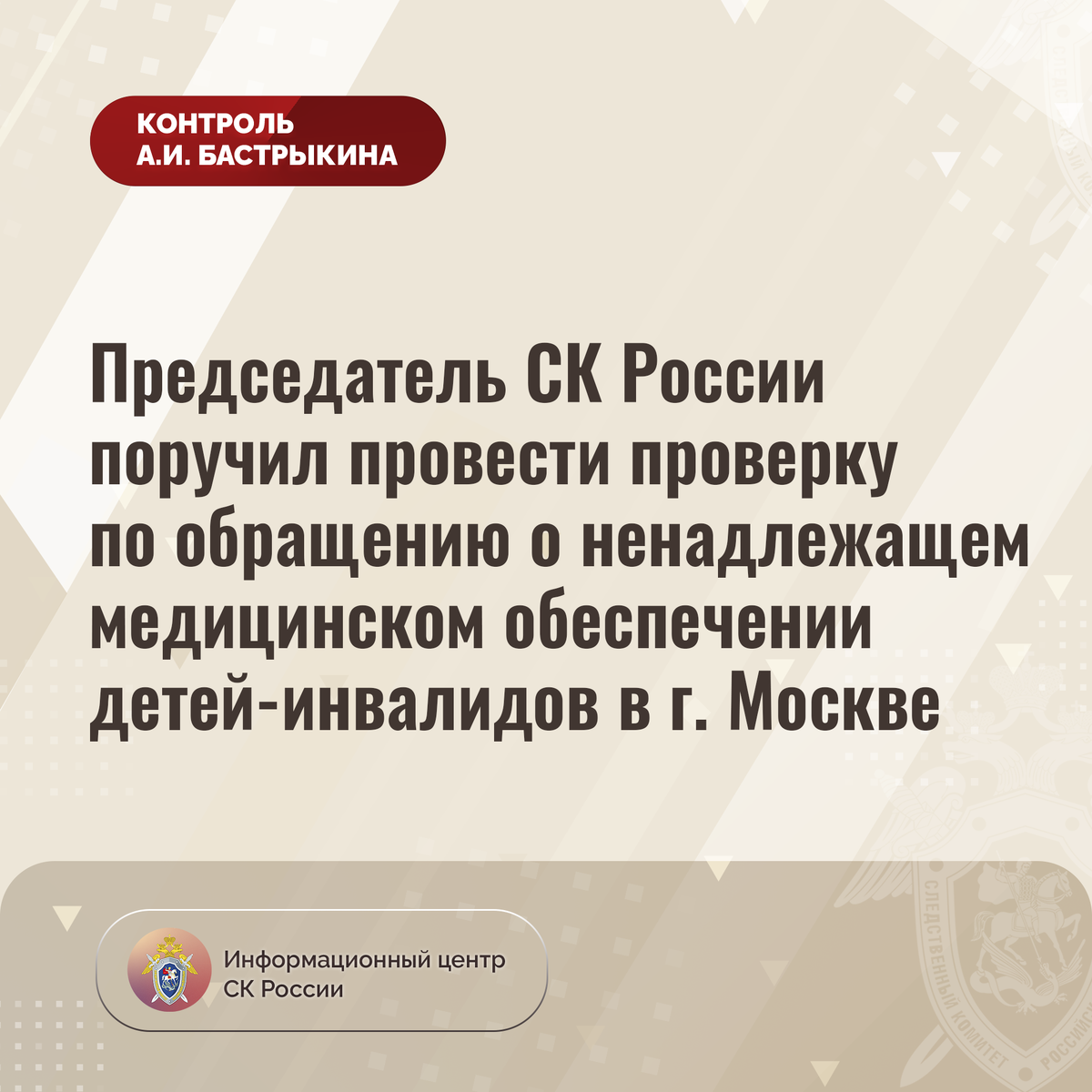 Председатель СК России поручил провести проверку по обращению о ненадлежащем медицинском обеспечении детей-инвалидов в г. Москве