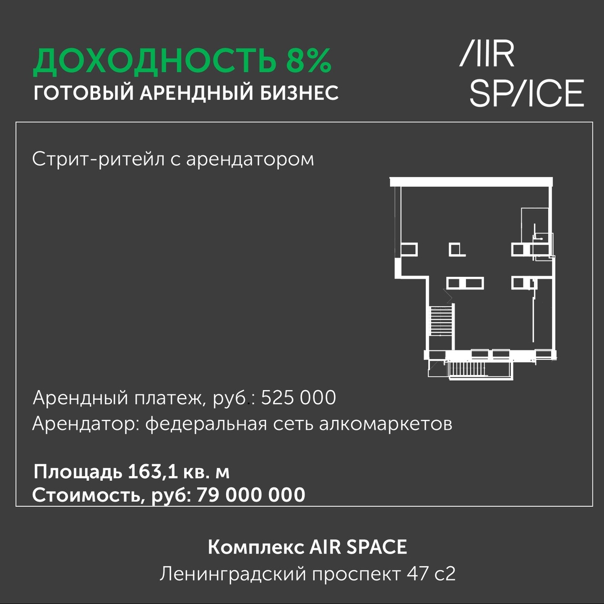 Идеальный вариант для инвестора, который ищет стабильный доход и надёжный актив в топовой локации Москвы. 📐 О помещении: · Площадь: 163,1 м² · Состояние: выполнена качественная отделка · Потолки: 3,29 м · Арендатор: федеральная сеть магазинов алкогольных напитков “Винлаб”(400+ точек по РФ) · Доход: поступает ежемесячно, с первого дня владения · Индексация: предусмотрена ежегодная в договоре аренды 📍 Локация: · Адрес: Ленинградский пр-т, 47с2 — первая линия · 1 минута от метро “Аэропорт” — отличная транспортная доступность · Рядом метро “Сокол” и “ЦСКА” · Активный пешеходный и автомобильный трафик 💡 Почему стоит инвестировать именно в этот объект: ✔️ Готовый арендатор — не нужно тратить время на поиск клиентов ✔️ Доходный бизнес в момент покупки — без простоев ✔️ Ликвидность — востребованная локация, арендаторы держатся годами ✔️ Перспектива роста — коммерческая недвижимость дорожает, особенно в районах с высокой проходимостью 🔎 Ключевые параметры инвестиции: · Ставка аренды 525 000