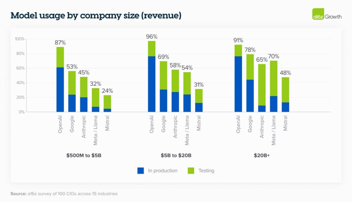 Недавно наткнулся на очень любопытное исследование от a16z https://a16z.com/ai-enterprise-2025/ про отношения американских CIO с генеративным ИИ. Честно говоря, такие вещи обычно пролистываю быстро, но тут зацепило.