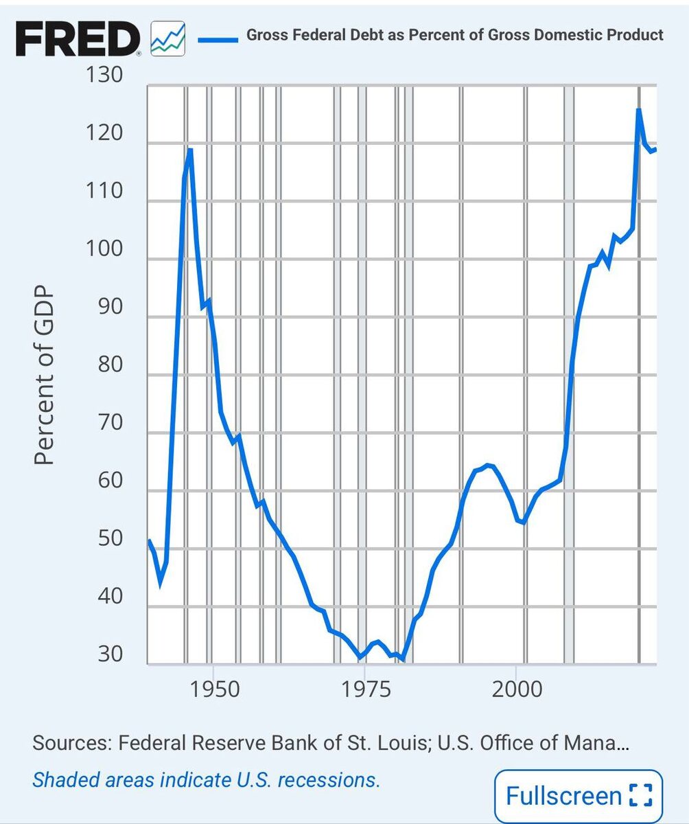 Как США уже однажды “выросли из долга” — и могут попробовать снова На графике — уровень федерального долга к ВВП США. После Второй мировой войны он был выше 120% — почти как сейчас. Но за 30 лет его снизили до 35%. Не сокращением расходов, не дефолтом, а инфляцией и ростом. Вот как это работало: — Экономика росла быстрее, чем расходы по долгу — Инфляция была выше, чем ставки по облигациям — ФРС держала ставки низкими, создавая отрицательные реальные ставки Это называется “финансовая репрессия”. Когда у тебя есть выбор: резать расходы или дать экономике «съесть» долг — выберут второе. Звучит знакомо? Сегодня снова: — долг выше 120% — ФРС держит ставки высокими, но всё меньше кто верит, что надолго — инфляция может стать политическим инструментом «раздолжнения» Главная идея — не паниковать от самого уровня долга. Вопрос не в цифре, а в стратегии его обесценивания через время и рост. Вопрос — получится ли провернуть это снова? Если интересно, могу сделать пост: «Как сегодня повт