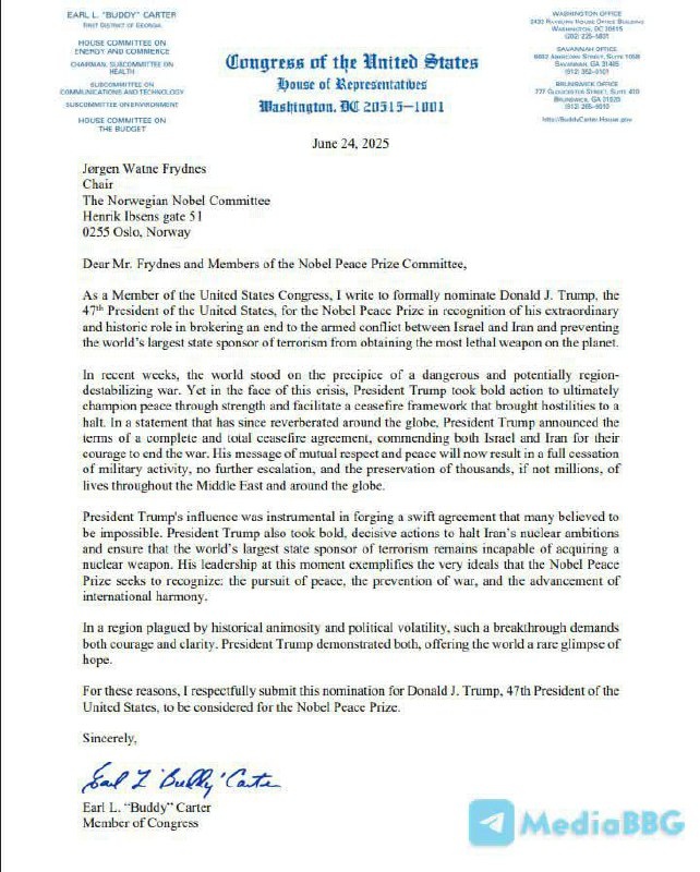 ⚡️Трампа номинировали на Нобелевскую премию мира за соглашение о прекращении огня между Ираном и Израилем