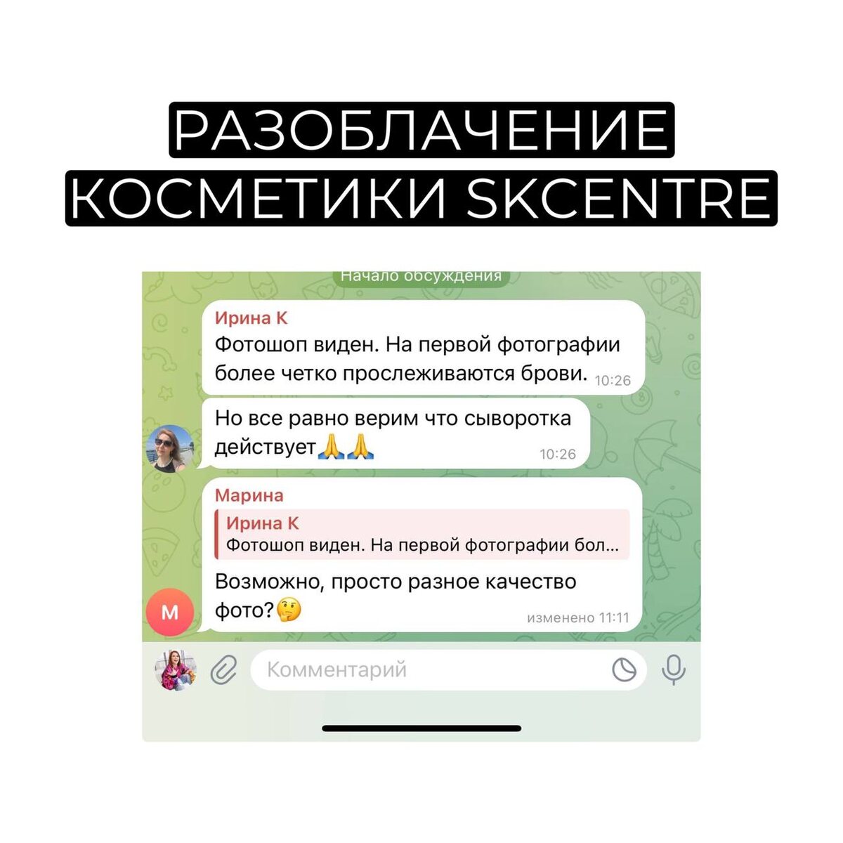Разоблачение на косметику Skcentre Это фотошоп! Это свет так лег! Это она просто похудела! Это вообще разные люди!!! Вы знаете, я уверена, что критическое мышление спасет мир и нельзя слепо верить всему, что видишь в интернете, это совершенно правильно. Мы с вами знаем множество примеров, когда реклама оказывалась лучше средства, которое она рекламировала. К сожалению, все это бывает. Но и косметика хорошего качества тоже бывает. Это тоже факт. И мы не можем это игнорировать. Пусть нам кажется, что это фотошоп или еще какие-то ухищрения, но эта конкретная женщина видит в зеркало свое лицо, со всех сторон и в разное время суток. И ей нравится результат! Кстати, вы видите выше на скринах, что у нас тоже есть те, кто сомневается, критикует, дает не самую приятную обратную связь. Но при этом, человек делает выбор не просто голословно критиковать, а попробовать именно на себе и вот, что из этого получается) И, конечно, всегда есть те, кому «не помогло». Да, так бывает, и на это тоже е