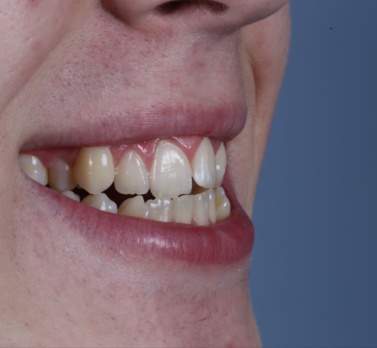 Пациент 17 лет. Мезиальный прикус. Основной рост завершён. Профиль лица устраивает. Лечение проводится на брекет-системе. То есть верхнюю зубную дугу увеличили, а нижнюю зубную дугу наоборот уменьшили по ширине и задвинули кзади. Это позволило создать правильное резцовое перекрытие. Лечение ещё не окончено. Но результат уже виден!