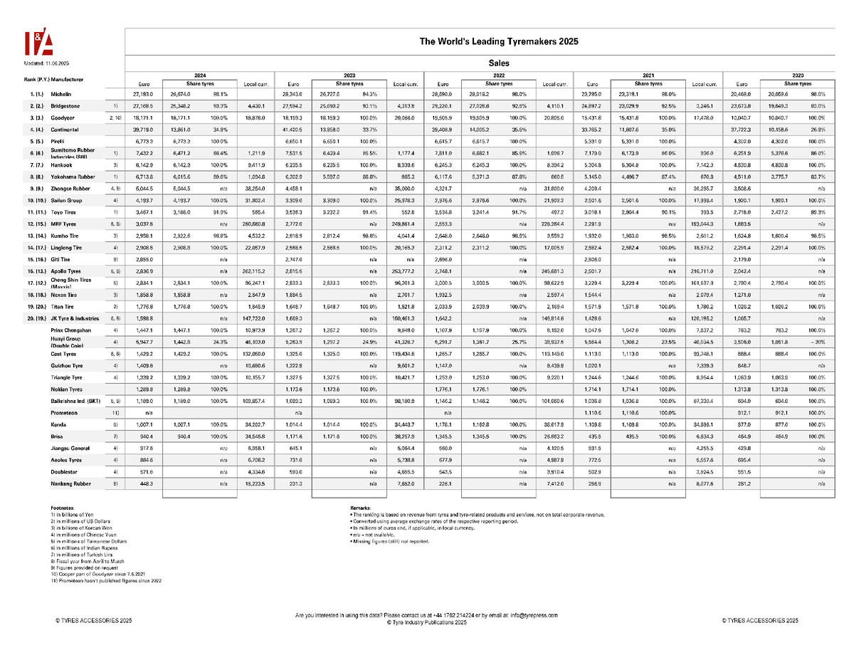 Рейтинг мировых шинных производителей 2025 (полная таблица)