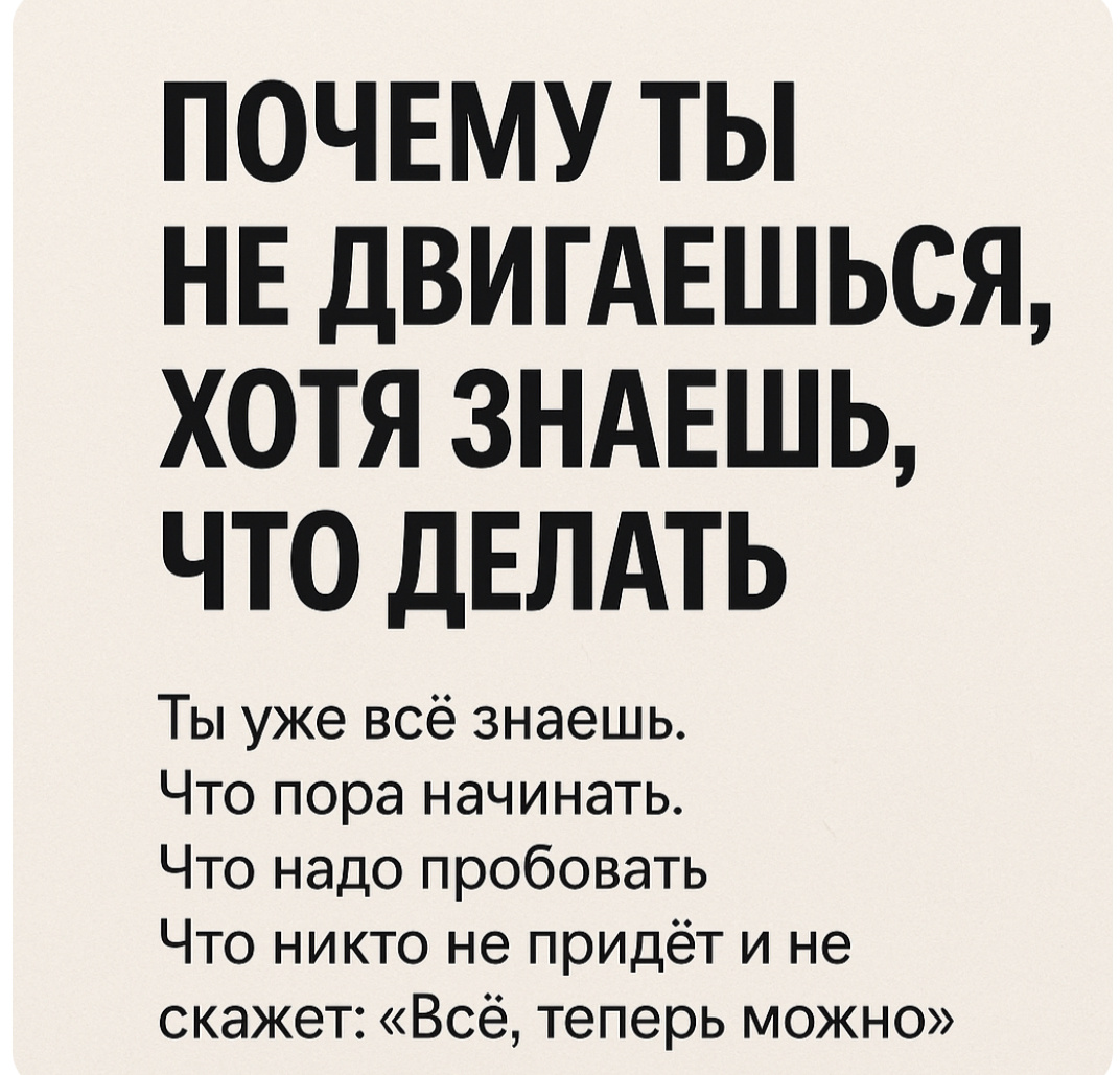 Ты уже всё знаешь. Что пора начинать. Что надо пробовать. Что никто не придёт и не скажет: «Всё, теперь можно». ⠀ Но ты залипаешь. Ты листаешь ленту. Ты сохраняешь себе мотивационные посты, видео, чек-листы. И ничего не меняется. ⠀ Потому что знание ≠ движение. ⠀ Твой мозг выбирает безопасность. Даже если это безопасность в скуке, в недовольстве, в тупике. ⠀ Запомни: 🧠 Мозгу похуй на твои цели. Он хочет стабильности и предсказуемости. ⠀ А ты хочешь роста. И вот тут начинается борьба. ⠀ ➡️ Начать — значит нарушить привычный порядок. ➡️ Сделать шаг — значит не знать, что будет. ➡️ Рисковать — значит встретиться с реальным собой. ⠀ И это страшнее, чем провал. Потому что если не получится — ты вроде как «никто». А если даже не попробуешь — можно вечно быть «тем, у кого был потенциал». Хочешь менять это — начни с действий. Маленьких. Глупых. Своих. ⠀ Я веду канал, где говорю об этом каждый день. Без воды, без соплей, без «поверь в себя». Только движение. Только мозг, система и жизнь по-на
